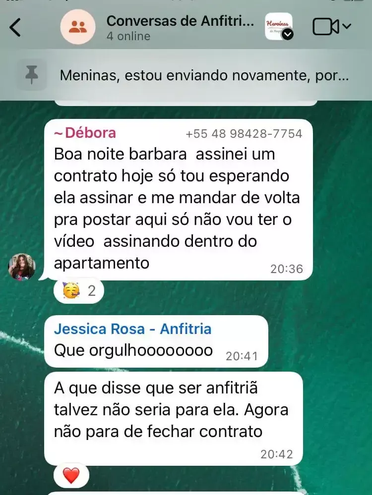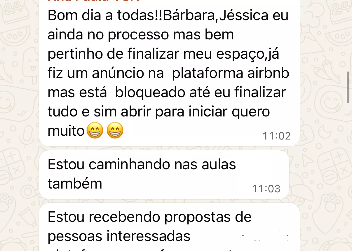 Na comunidade do WhatsApp Heroínas da Hospitalidade você conversa, tira dúvidas, aprende em conjunto com dezenas de mulheres como você. A Jéssica e a equipe Você Anfitriã estão sempre por lá para te ajudar!