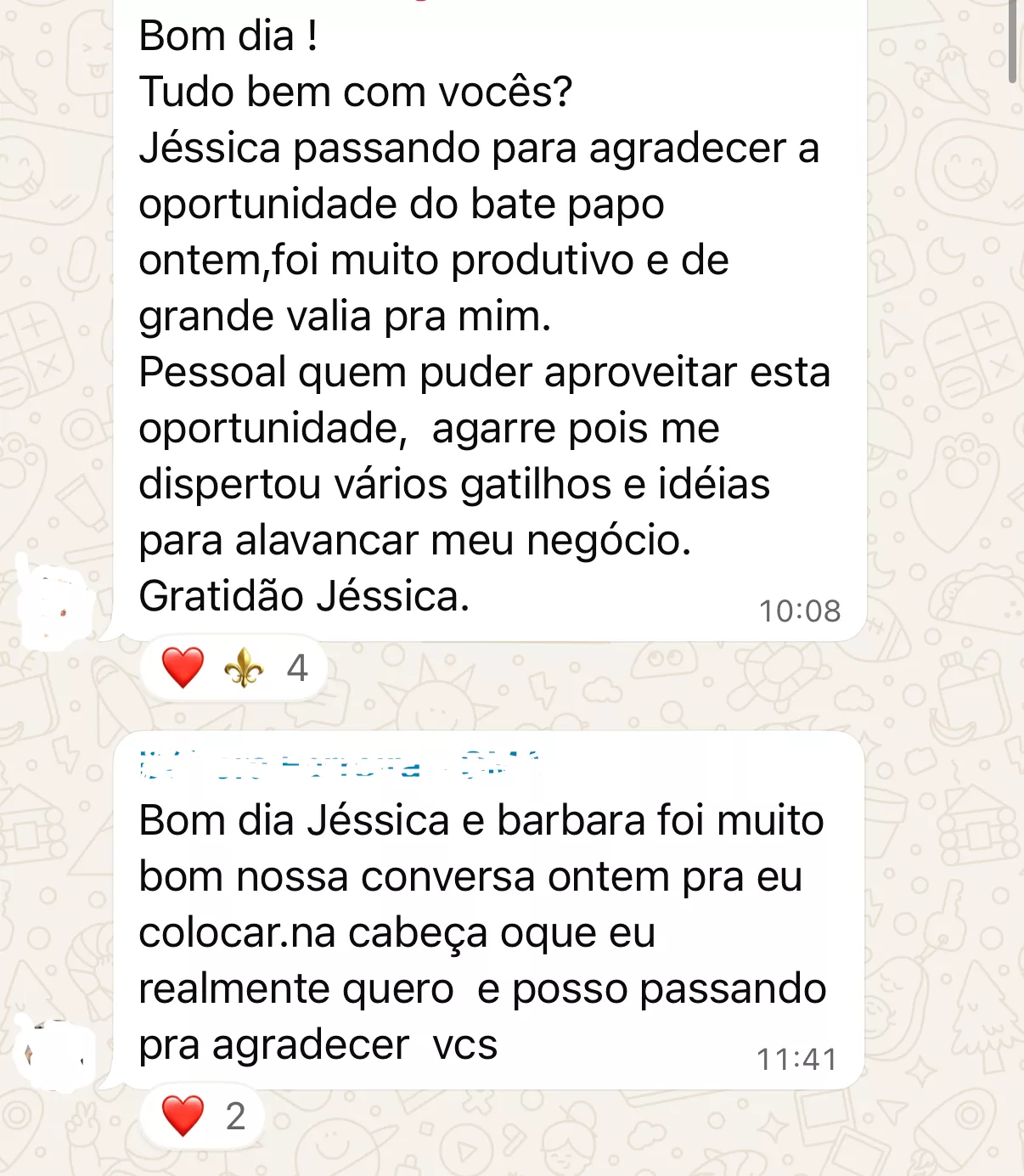 Grupo de WhatsApp onde a Jéssica e sua equipe interagem com as alunas do Você Anfitriã e onde você poderá tirar suas dúvidas, conversar com outras co-anfitriãs e se sentir sempre segura e amparada em sua jornada.